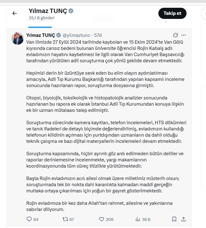 Adalet Bakanı Yılmaz Tunç, kamuoyunun tepkisine neden olan Rojin Kabaiş soruşturmasına ilişkin sosyal medyadan açıklama yaptı.