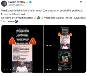 Hayko Cepkin, Van Yüzüncü Yıl Üniversitesi’nde gerçekleştirilmesi planlanan konserinin iptal edildiğini duyurdu.