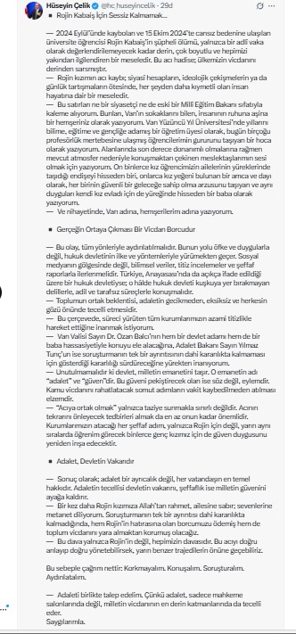 Çelik, “Bu olay yalnızca bir adlî vaka değil, toplum vicdanını ilgilendiren çok boyutlu bir meseledir. Rojin’in kaybı, insan hayatının önemini gösteriyor. Konuşmamı ne bir siyasetçi ne de eski bakan sıfatıyla yapıyorum. Van’ın insanını ve ruhunu bilen bir hemşeri, Van YYÜ’de öğretim üyesi olarak öğrencilerinin gururunu taşıyan bir hoca, kız öğrencilerin ailelerinin endişesini hisseden bir amca ve dayı olarak yazıyorum. Van adına, hemşerilerim adına yazıyorum. Olayın tüm yönleriyle aydınlatılması gerekir; bu süreç hukuk devleti ilkeleri ve bilimsel verilerle yürütülmelidir” dedi.