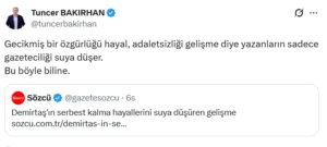 Bakırhan, sosyal medya hesabından yaptığı paylaşımda, haberde kullanılan ifadeleri eleştirerek şu sözleri kullandı: “Gecikmiş bir özgürlüğü hayal, adaletsizliği gelişme diye yazanların sadece gazeteciliği suya düşer. Bu böyle biline.”