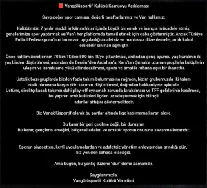 Kulüp yönetimi, alınan kararın genç sporcuların haklarını ve Van amatör sporunun geleceğini koruma amacı taşıdığını belirtti.